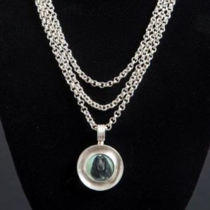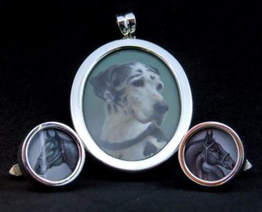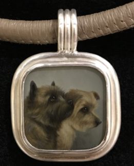 Burnett de Loiselle custom jewelry combines silver- and goldsmithing by SUSAN BURNETT with BETH DE LOISELLE’s miniature oil paintings.  Each item, whether a pendant or cuff bracelet, is custom made for the client. Pendants can be worn on chains, on leather, or with pearls or stone beads.