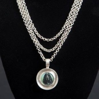 Burnett de Loiselle custom jewelry combines silver- and goldsmithing by SUSAN BURNETT with BETH DE LOISELLE’s miniature oil paintings. Each item, whether a pendant or cuff bracelet, is custom made for the client. Pendants can be worn on chains, on leather, or with pearls or stone beads.