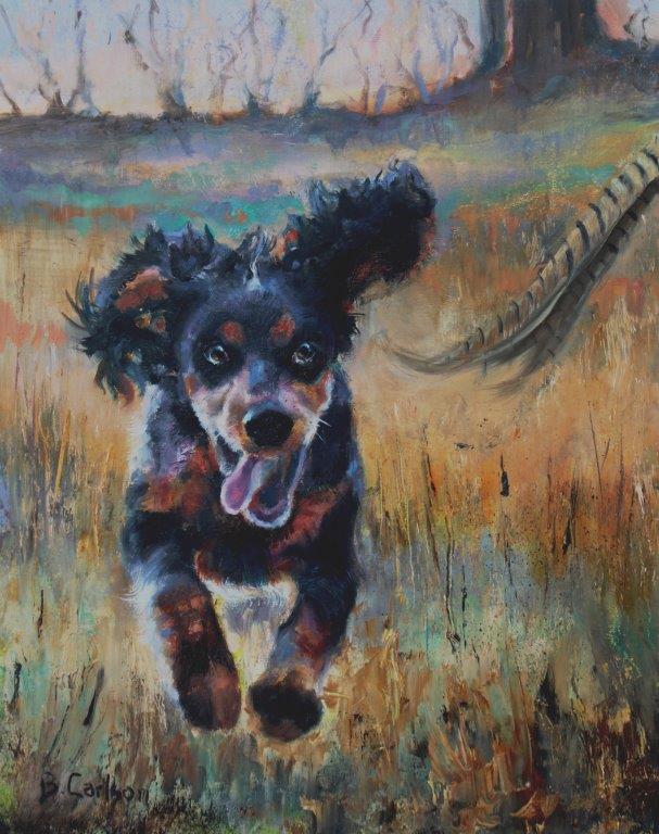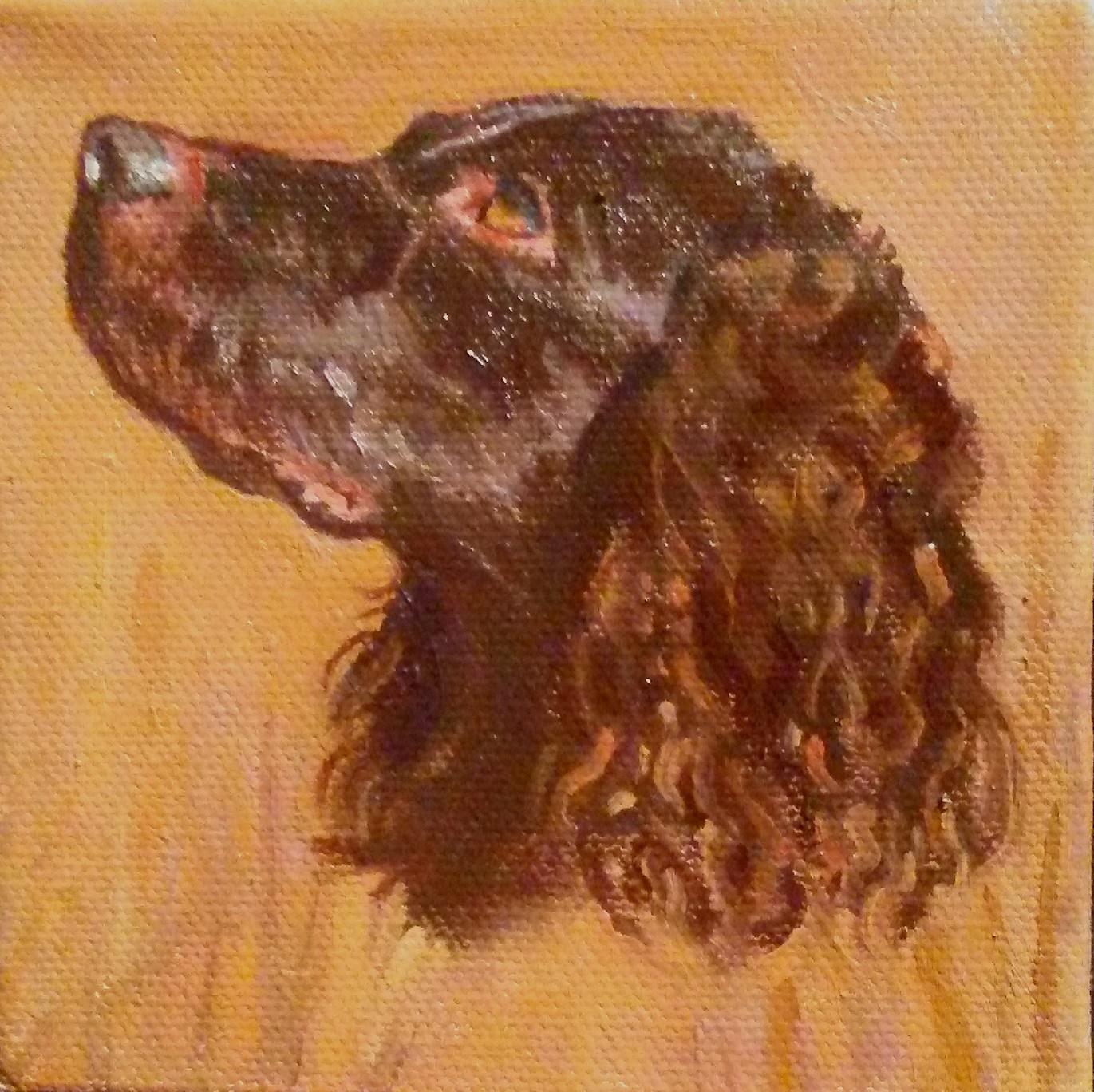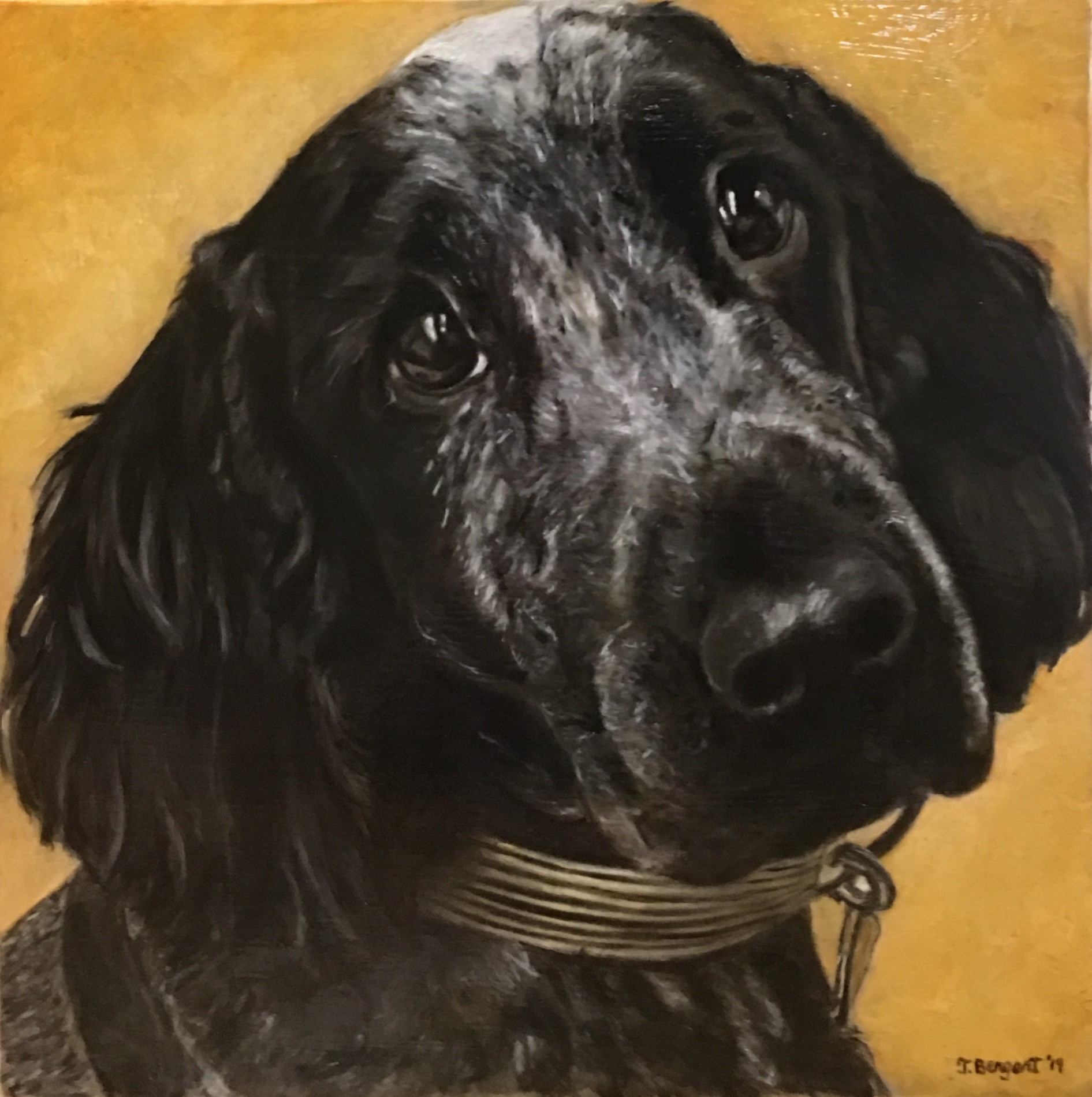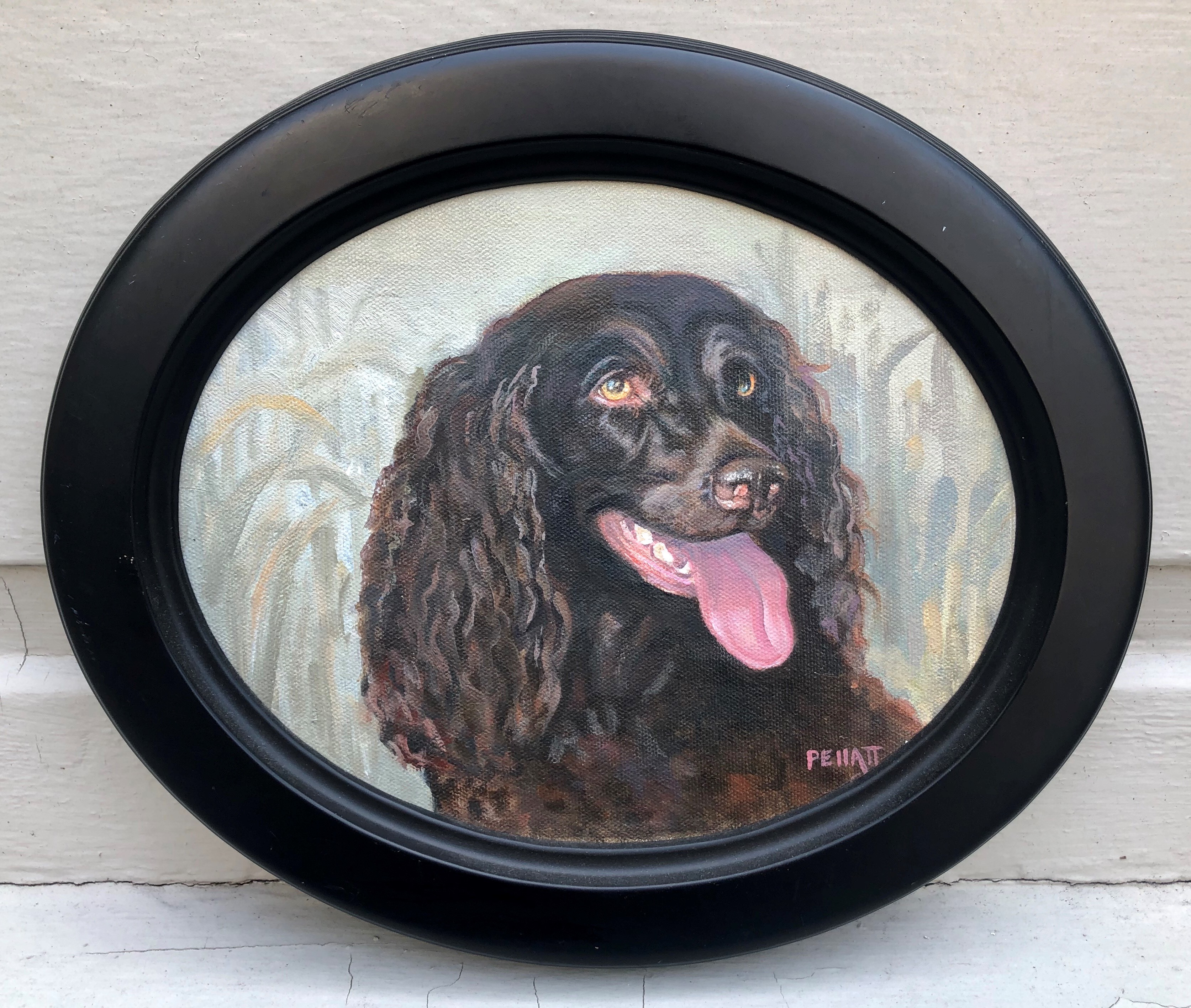 - “English Cocker Tenacity”, Beth Carlson, Oil on canvas, 10 x 8″, $800