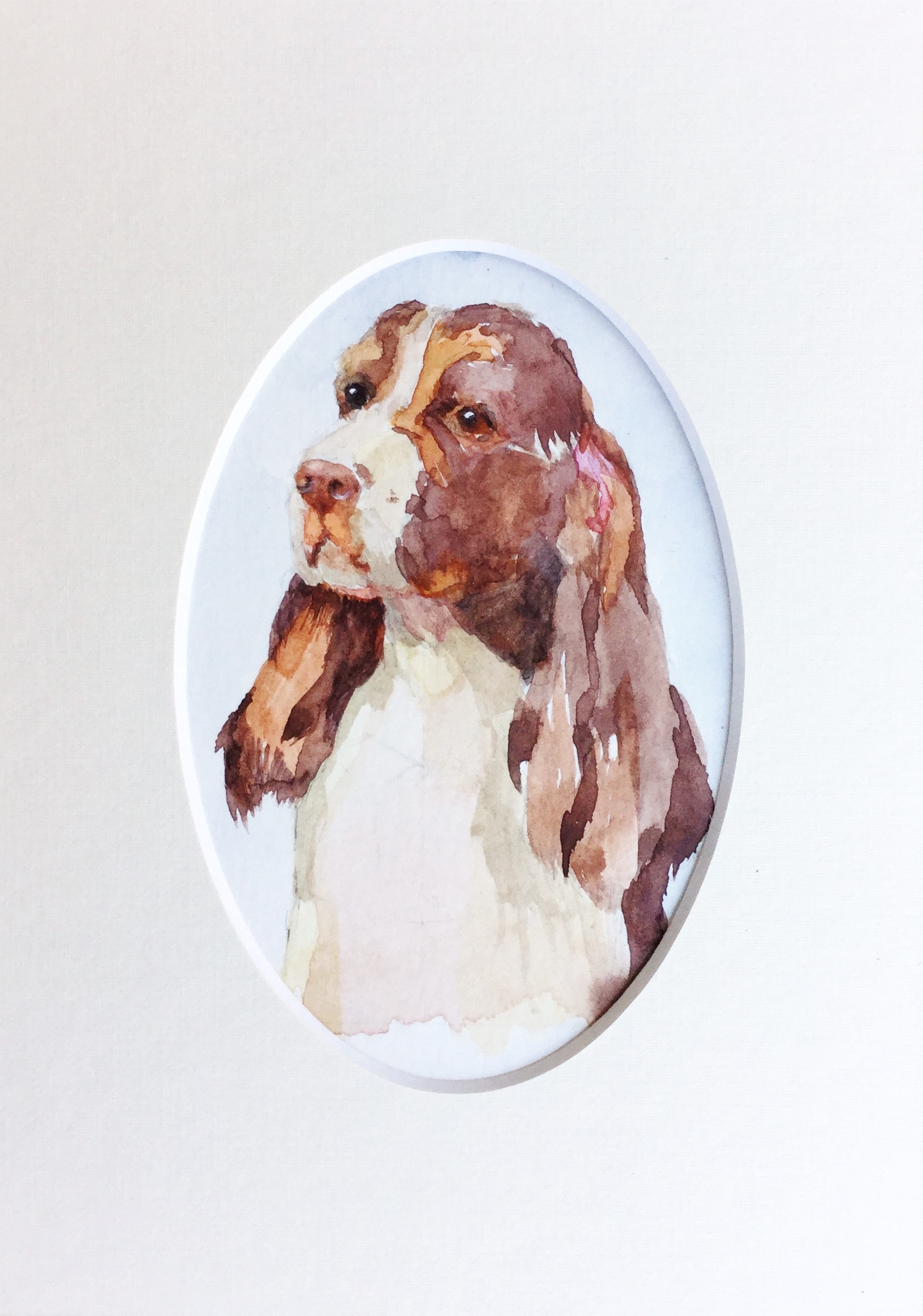 - Nancy van Meter, “North Wales Springer” watercolor 4 x 3 $325