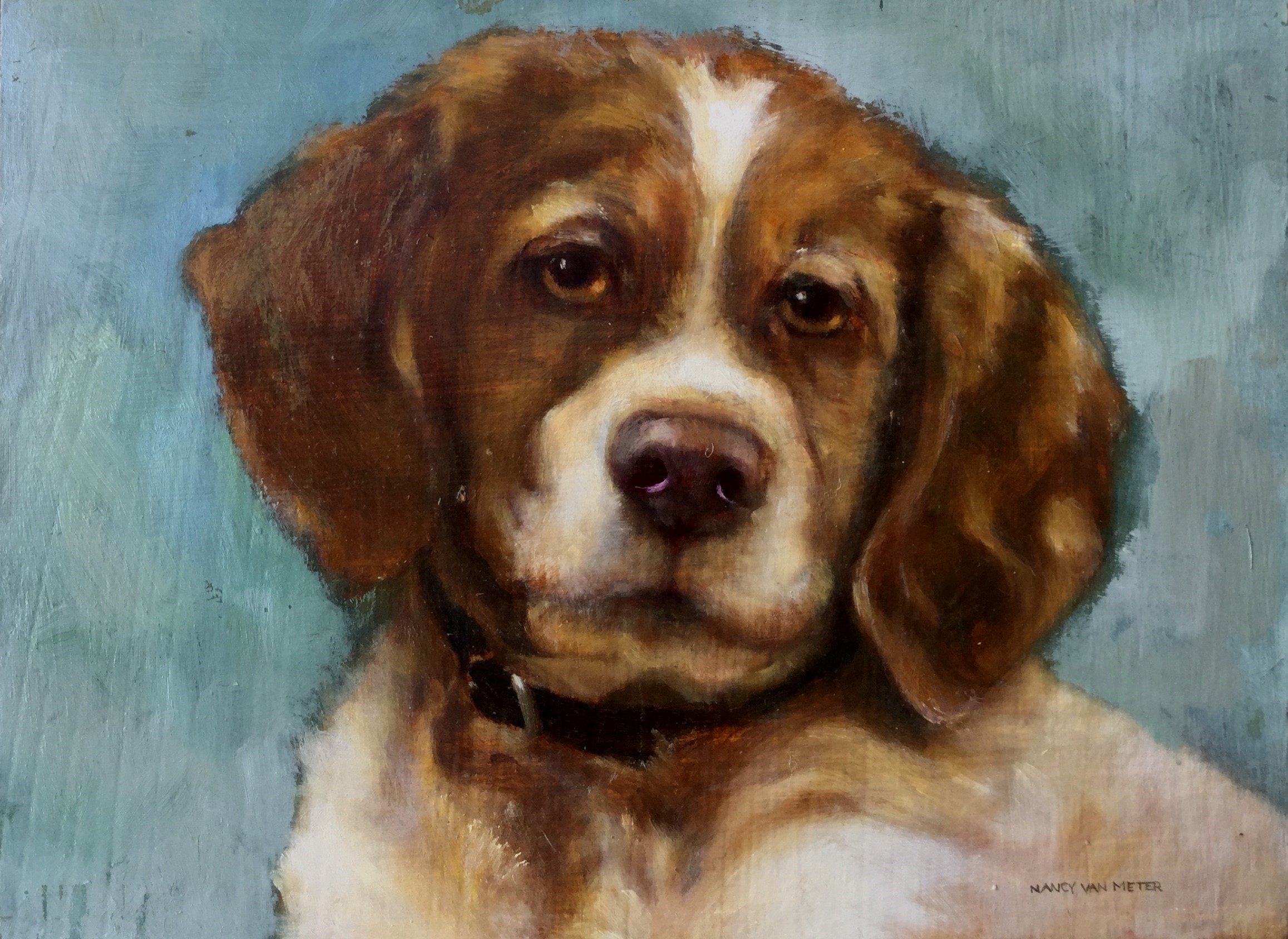 - Kathryn Freeman, “Spaniel with Blue Shoe,” 8 x 8″, oil on panel